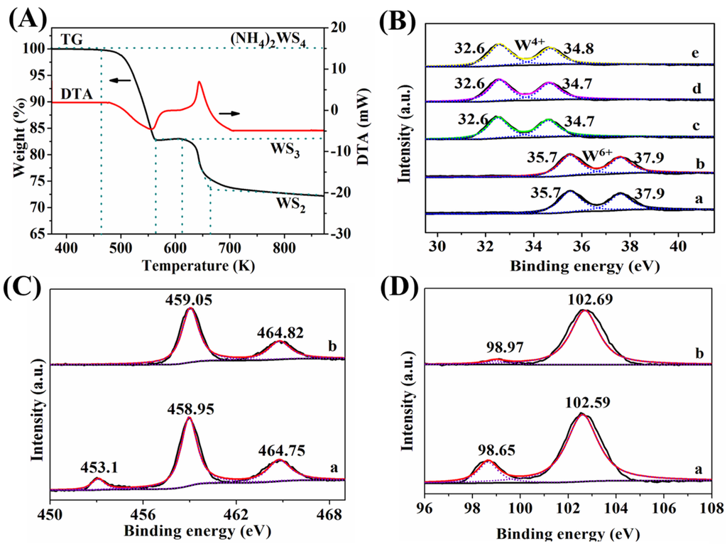 (A) TG-TDA (thermogravimetric-differential thermal analysis) curves of the decomposition of (NH4)2WS4; (B) XPS spectra of the W 4f regions for WS2-1/TiSi2 calcined at (a) 473, (b) 623, (c) 673, (d) 723 and (e) 773 K for 2 h; (C) High-resolution XPS (X-ray photoelectron spectroscopy) spectra of Ti 2p in (a) TiSi2 and (b) WS2-1/TiSi2-723; (D) High-resolution XPS spectra of Si 2p in (a) TiSi2 and (b) WS2-1/TiSi2-723.
