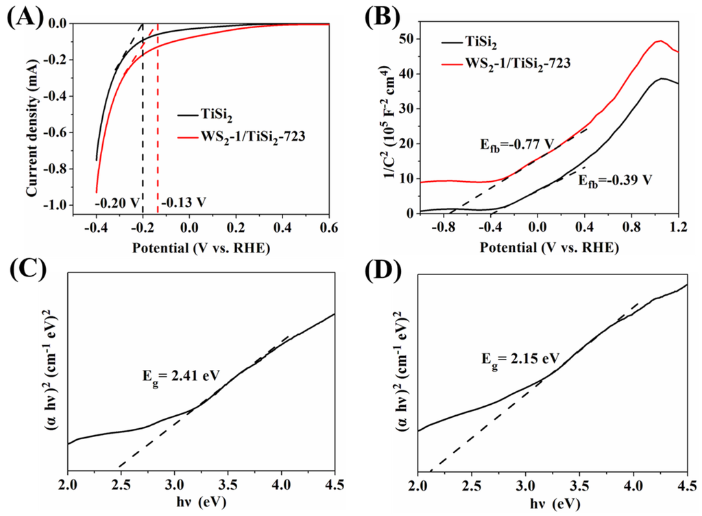 (A) The linear sweep voltammetry plots of the TiSi2 and WS2-1/TiSi2-723 electrodes scanning from −1.0 to 0 V vs. SCE (saturated calomel electrode) with a scan rate of 50 mV·s−1, the proton reduction potential at 0 mA is −0.20 V for TiSi2 and −0.13 V for WS2-1/TiSi2-723; (B) the Mott-Schottky plots of the TiSi2 and WS2-1/TiSi2-723 electrodes. Tauc plots of (C) TiSi2 and (D) WS2-1/TiSi2-723.