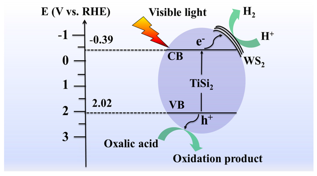 The proposed mechanism of photocatalytic H2 evolution on the WS2/TiSi2 catalyst is shown in Scheme 1. Under visible-light irradiation, the electrons in the valence band (VB) of TiSi2 are stimulated to the conduction band (CB). Then, the photo-generated electrons transfer from the conduction band of TiSi2 to the WS2, where H+ is reduced to hydrogen. The holes that remained on the valence band of TiSi2 transfer to the surface and react with the oxalic acid in the solution. This process efficiently inhibits the photo-generated charges recombination, and significantly enhances the photocatalytic hydrogen evolution efficiency.
