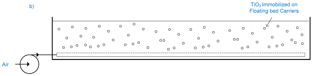 | Reactor Type | Pollutant and Concentration | Volume/ Flowrate | Water Matrix | Support | UV-A W/m2 | Destruction Percent (%) | Reactor Footprint m2 | Treatment Duration | Throughput L/h/m2 | Ref. |