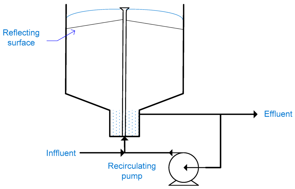 | Packed CPC | Amazil | 8 L | Secondary treated municipal WW | Glass spheres | 30 | 70 | 0.25 | 13.3 h b | 2.41 | [45] |
