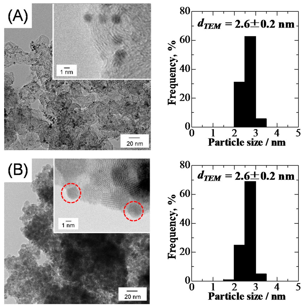 Figure 2 shows transmission electron microscopy (TEM) images and particle size distribution histograms of Pt2Ru3/CB and Pt2Ru3/Sb-SnO2. The average particle size dTEM (determined from 500 particles in several TEM images), standard deviation σd, chemical composition, and amount of metal supported are summarized in Table 1. Since the transmittance of the electron beam for Pt2Ru3 alloy nanoparticles and Sb-SnO2 support particles was very similar, it was difficult to distinguish the Pt2Ru3 alloy nanoparticles in a single TEM image. Therefore, we measured the sizes of Pt2Ru3 particles from a dozen different images (four typical images of Pt2Ru3/Sb-SnO2 are shown in Figure S3). Nanoparticles ranging from 2 to 3 nm in size were uniformly dispersed on CB and Sb-SnO2 supports. The values of d and very narrow size distributions (σd < 10% of dTEM) for both catalysts were nearly identical, 2.6 ± 0.2 nm, as seen in the histograms. It is also noteworthy that the average chemical compositions of Pt-Ru analyzed by inductively-coupled plasma mass analyzer (ICP-MS) were nearly equal to the projected value (Pt2Ru3) for both catalysts. Thus, we succeeded in preparing Pt2Ru3 nanoparticles highly dispersed on both Sb-SnO2 and CB, with the identical alloy composition as well as the identical size distribution, by the use of the nanocapsule method.