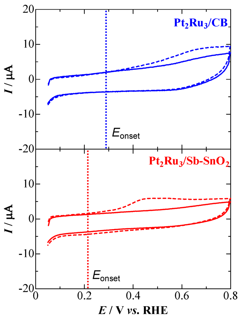 Figure 4. CO stripping voltammograms at Nafion-coated Pt2Ru3/CB and Pt2Ru3/Sb-SnO2 electrodes measured in N2-purged 0.1 M HClO4 at 70 °C and a potential sweep rate of 0.02 V·s−1. The solid lines indicate the CV at the CO-free electrode. The vertical dotted line shows the onset potential (Eonset) for the oxidation of adsorbed CO. Carbon monoxide was adsorbed on the working electrode by supplying 0.1 M HClO4 solution saturated with 5% CO (He balance) at a mean linear flow rate of 10 cm·s−1 (corresponding to a volume flow rate of 2 cm3·s−1) for 30 min while maintaining the potential at 0.05 V.