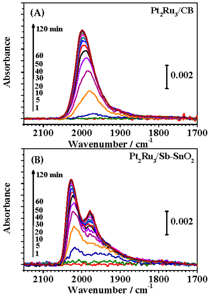 Figure 5. Changes in FTIR spectra observed on Nafion-coated (A) Pt2Ru3/CB and (B) Pt2Ru3/Sb-SnO2 electrodes at 0.02 V and 60 °C during CO adsorption in 0.1 M HClO4 with bubbling 1% CO (H2 balance) for 120 min.