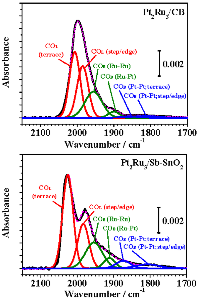 Figure 6. Deconvolution of FTIR spectra observed on Pt2Ru3/CB and Pt2Ru3/Sb-SnO2 at 0.02 V and 60 °C after 2 h of 1% CO/H2 gas bubbling in 0.1 M HClO4. Curve fitting was performed for all spectra with the full width at half maximum (FWHM) fixed as a constant while allowing the peak wavenumbers and areas to vary, based on previous work (see Table S1). The COL bands around 2020–1980 cm−1 was deconvoluted into two components, which could be assigned to COL on terrace and step-edge sites, respectively. The CO-Ru bands around 1960–1900 cm−1 were deconvoluted into two components, which were assigned to COB on Ru-Ru and Ru-Pt sites, respectively. The COB(Pt-Pt) bands around 1850–1790 cm−1 were also deconvoluted into two components, which could be assigned to COB(Pt-Pt) on terrace and step-edge sites, respectively. These spectra were normalized with respect to the total intensities of peaks assigned to COL, I[COL]; ( ------- ) experimental spectrum, ( ―― ) sum of six peaks, ( ―― ) COL peaks, ( ―― ) CO-Ru peaks(consisting of COB(Ru-Ru) and COB(Ru-Pt)), and ( ―― ) COB(Pt-Pt) peaks.