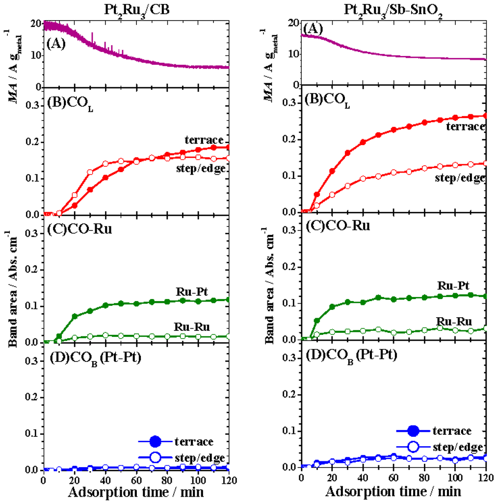 Second, the values of I[CO-Ru] (CO bridged on Pt-Ru and Ru-Ru sites) and their changes with time were nearly comparable for both catalysts (Figure 7C). Thus, neither I[COB(Pt-Pt)] nor I[CO-Ru] can be correlated with the improvement in the CO-tolerance on the Sb-SnO2 supported catalyst. In contrast, two clear differences in the adsorption behavior of COL were seen between the two catalysts in Figure 7B, i.e., the intensity ratio of COL, step/edge to COL, terrace and its variation with time. The ratio I[COL, step/edge] to I[COL, terrace] on the Sb-SnO2-supported catalyst was smaller than that on the CB-supported one, and the increase in I[COL, step/edge] on the former was slower.