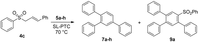 When the reaction was carried out in the presence of Aliquat as catalyst in DMSO, only the desired 1,2,4-triphenylbenzene 7a was recovered in 65% yield (Table 2, entry 1). When the temperature was increased to 100 °C a slight drop of the yield of 7a was observed along with the formation of 5% of the sulfonyl derivative 9a (Table 2, entry 2). Lower yield of 7a was obtained by using 1.1 equiv of NaOH, whereas a sharp decrease in selectivity was observed without Aliquat (Table 2, entries 3 and 4). A completely chemoselective reaction was obtained in the presence of PEG 1000 (0.4 equiv) without organic solvent (Table 2, entry 5). Lower yields were obtained when lower or higher amounts of PEG were used (Table 2, entries 6 and 7).