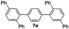 4′,5′′′-diphenyl-1,1′:2′,1′′:4′′,1′′′:2′′′,1′′′′-quinquephenyl (7e): yield 15%, mp 255.6–258.1 °C. 1H NMR (300 MHz, CDCl3): δ 7.79–7.06 (m, 30H). 13C NMR (300 MHz, CDCl3): δ 141.5, 141.1, 139.7, 131.2, 131.1, 130.4, 129.9, 129.3, 128.8, 127.9, 127.5, 127.2, 126.6, 126.2, 126.0, 125.9. APCI–MS: m/z = 535.3 [M + H]+.