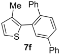 2-(2′-1,1′:4′,1′′-terphenyl)-3-methyl-thiophene (7f): yield 63%, mp 111.8–114.3 °C. 1H NMR (300 MHz, CDCl3): δ 7.46–7.37 (m, 4H), 7.17–7.07 (m, 10H), 6.64 (d, 1H), 2.33 (s, 3H). 13C NMR (300 MHz, CDCl3): δ 141.2 (C), 141.1 (C), 140.7 (C), 139.4 (C), 137.3 (C), 134.0 (C), 133.4 (C), 131.1 (CH), 130.8 (CH), 129.90 (CH), 129.8 (CH), 127.9 (CH), 126.6 (CH), 126.6 (CH), 123.6 (CH), 15.1 (CH3).