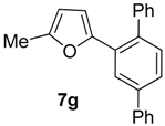 2-(2′-1,1′:4′,1′′-terphenyl)-3-methyl-furan (7g): yield 51%, oil. 1H NMR (300 MHz, CDCl3): δ 7.7–7.2 (m, 13H), 6.61 (d, 1H, J = 3.2), 6.08 (d, 1H, J = 3.2), 2.39 (s, 3H). 13C NMR (300 MHz, CDCl3): δ 152.2 (C), 151.9 (C), 141.5 (C), 141.2 (C), 140.9 (C), 138.9 (C), 137.9 (C), 131–125 (13CH), 107.8 (CH2), 106.2 (CH2), 13.7 (CH3).