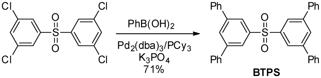 Synthesis of 5′,5′′′′-sulfonyl-di-[1,1′:3′,1′′]-terphenyl (BTPS).