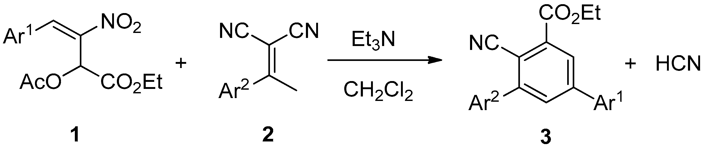 - Gopi, E.; Namboothiri, I.N. One-pot regioselective synthesis of meta-terphenyls via [3 + 3] annulation of nitroallylic acetates with alkylidenemalononitriles. J. Org. Chem. 2014, 79, 7468–7476. [Google Scholar] [CrossRef] [PubMed]