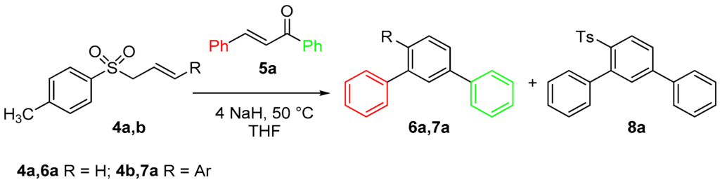 On the other hand, a mixture of meta-terphenyl 6a along with sulfonyl-meta-terphenyl 8a has been obtained by reacting allylsulfone 4a with chalcone 5a in the presence of excess of NaH in THF at 50 °C (Scheme 3) []. By the same approach, 1,2,4-quaterphenyls 7a can also be obtained by using an aryl substituted allyl sulfone 4b [].