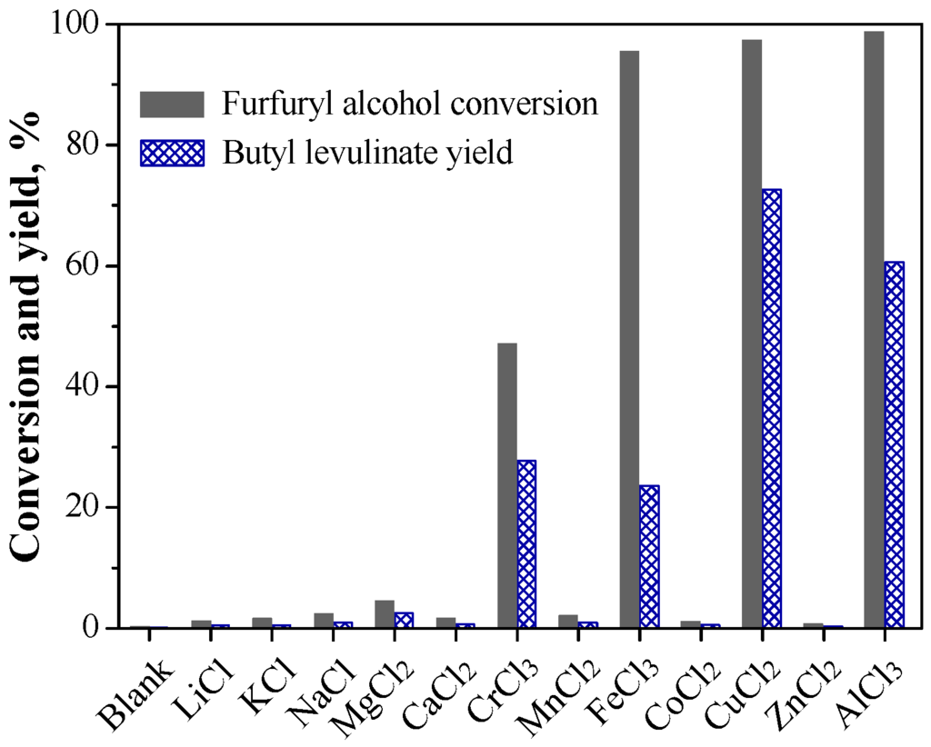 Catalytic comparison of various metal chlorides on the conversion of furfuryl alcohol to butyl levulinate. Reaction conditions: 0.3 mol/L furfuryl alcohol in n-butanol; metal chloride concentration of 0.02 mol/L; reaction temperature of 110 °C; reaction time of 60 min.