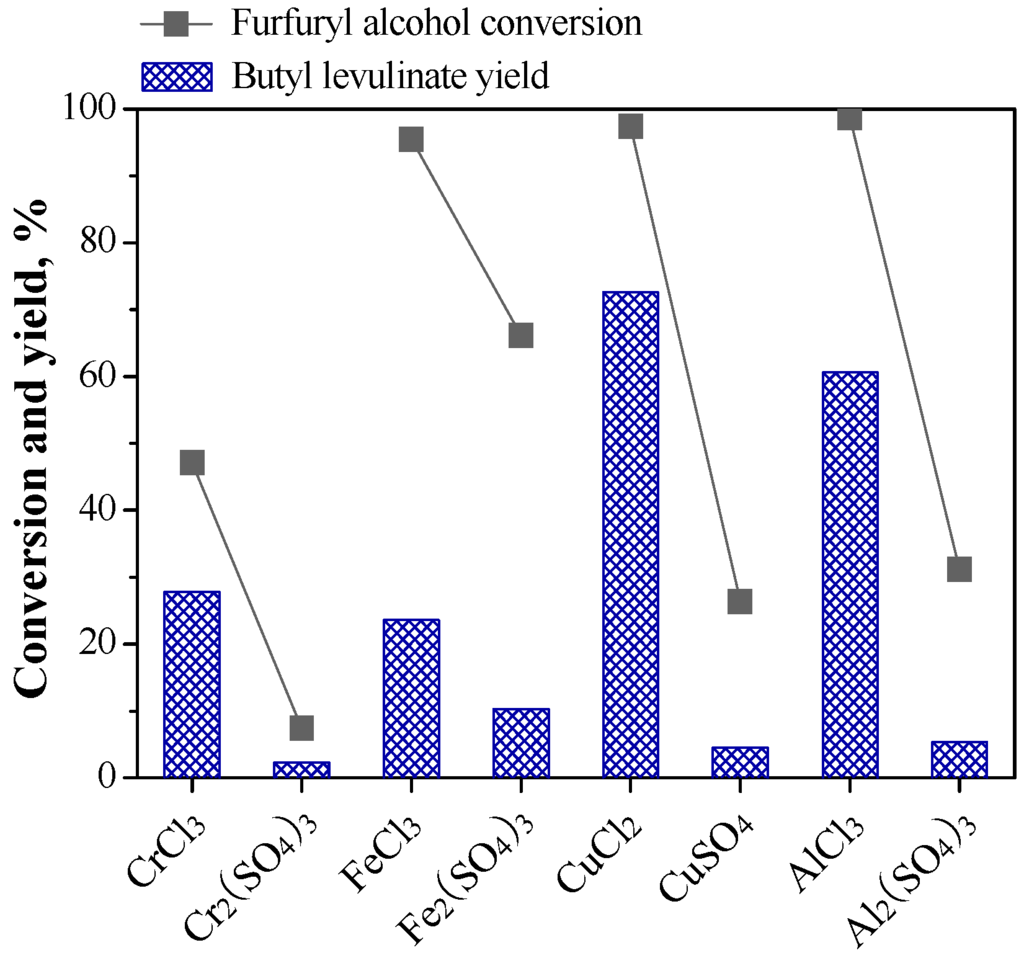 Catalytic comparison of four typical metal chlorides and sulfates on the conversion of furfuryl alcohol to butyl levulinate. Reaction conditions: 0.3 mol/L furfuryl alcohol in n-butanol; metal salt concentration of 0.02 mol/L (based on Men+); reaction temperature of 110 °C; reaction time of 60 min.