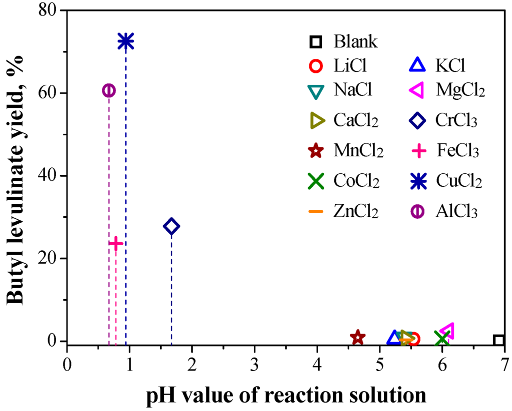 Relationship between butyl levulinate yield (data from Figure 1) and initial pH value of n-butanol solution with 0.02 mol/L metal chlorides measured at room temperature.