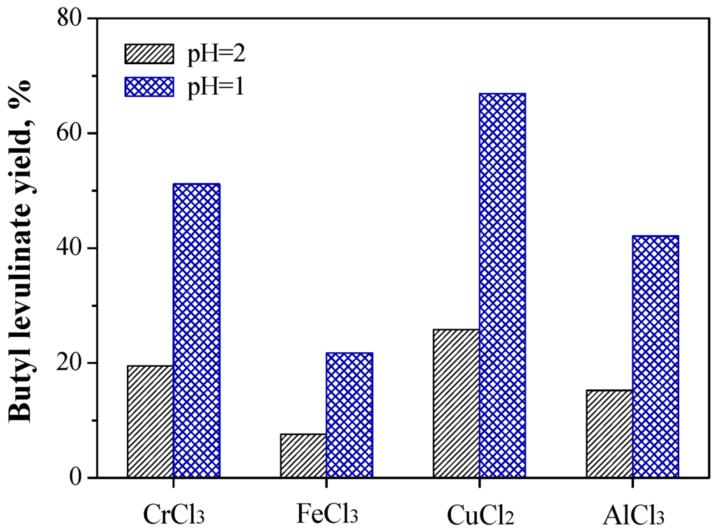 Butyl levulinate yield for four typical metal chlorides at the two same initial pH values of n-butanol solution adjusted by metal chlorides dosage. Reaction conditions: 0.3 mol/L furfuryl alcohol in n-butanol; reaction temperature of 110 °C; reaction time of 60 min.
