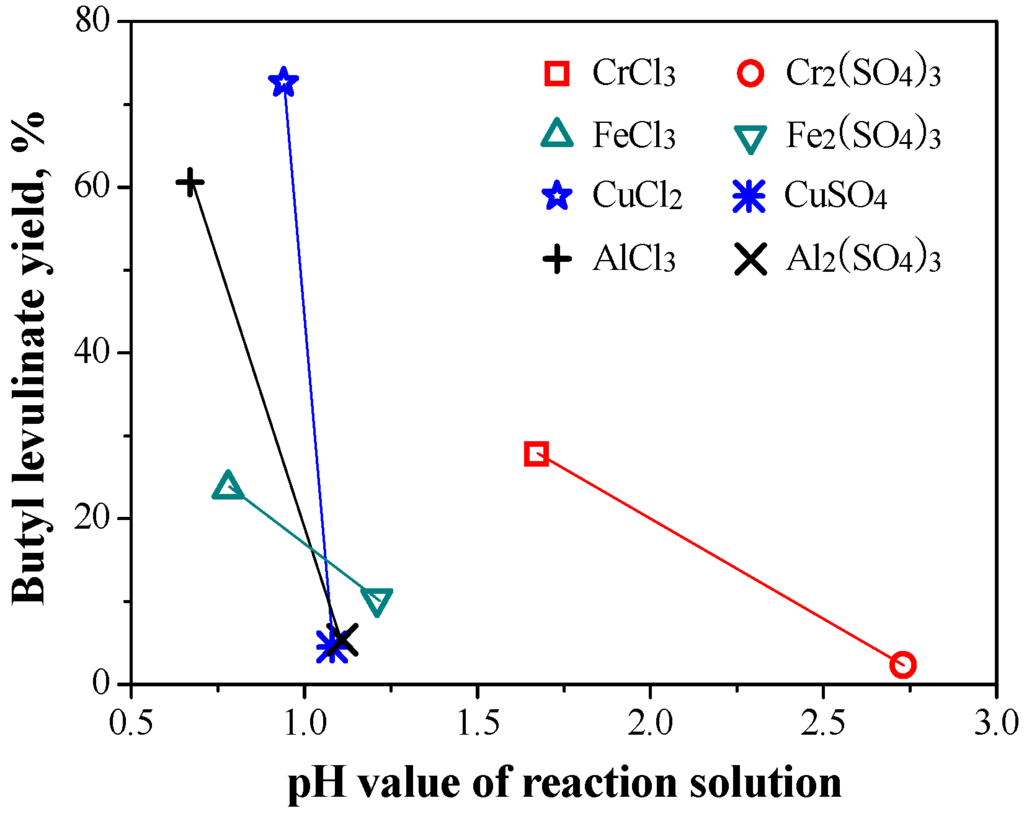 Next, Figure 6 presents the relationship between the butyl levulinate yield (data from Figure 2) and the initial pH value of the reaction system with various metal chlorides and sulfates. For all investigated metal sulfates, the butyl levulinate yield was lower than that for their corresponding chlorides. Accordingly, the pH value of the reaction system with metal sulfates was high, and fewer Brønsted acid sites were available for metal sulfates. This finding suggests that there is a good agreement between the reaction performance and Brønsted acidity. However, when we conducted experiments at the same initial pH value of the reaction system for metal chlorides and sulfates, the yield of the butyl levulinate for the sulfates of Cr(III), Cu(II) and Al(III) was still significantly lower than that for their corresponding chlorides (see Figure 7). A possible explanation for these appearances is that the reaction performance depends not only on the Brønsted acidity of the reaction system, but also on the Lewis acidity of the metal salts, and the Lewis and Brønsted acidity for metal sulfates are weaker than those for their corresponding chlorides [34,35]. By and large, the presentation of the optimal Lewis and Brønsted acid sites for the efficient conversion of furfuryl alcohol to butyl levulinate is derived from a valid combination of cations and anions.