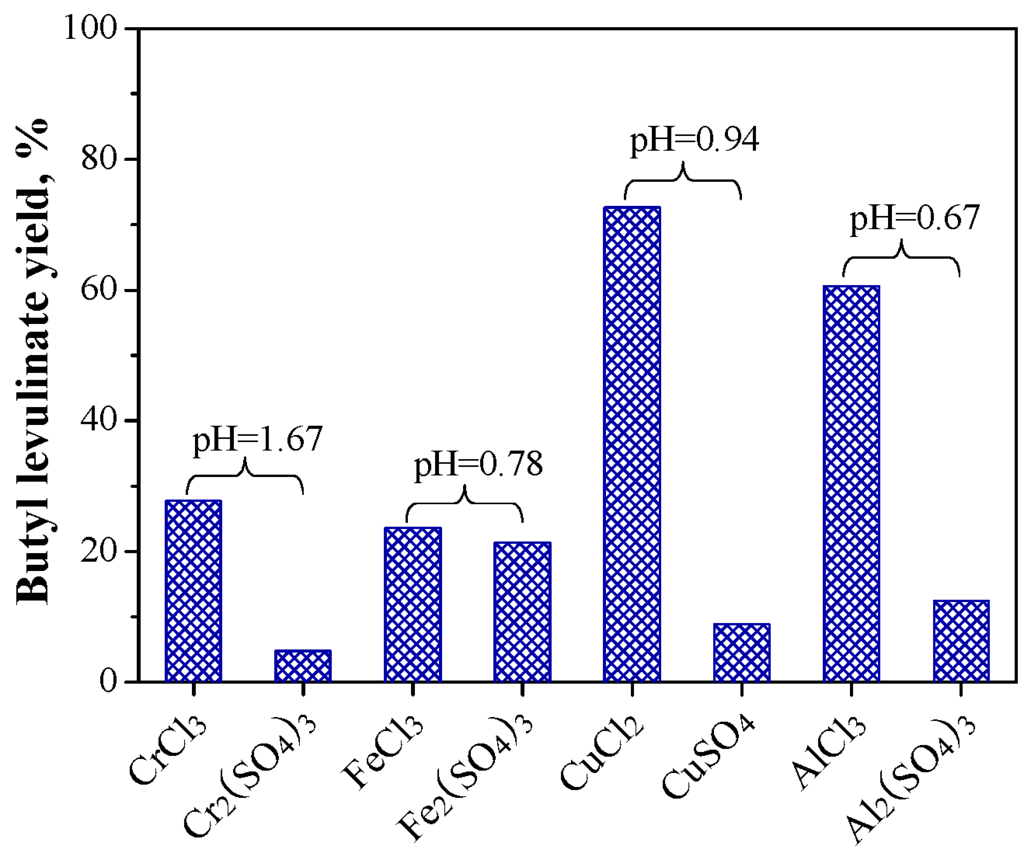Butyl levulinate yield for metal chlorides and sulfates at the same initial pH value of n-butanol solution adjusted by metal salts dosage. Reaction conditions: 0.3 mol/L furfuryl alcohol in n-butanol; reaction temperature of 110 °C; reaction time of 60 min.