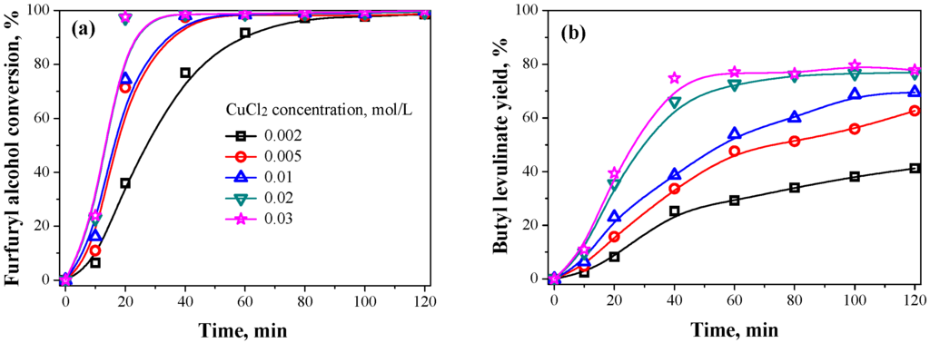 Among the tested metal chlorides as the catalysts, CuCl2 was found to be uniquely effective in the conversion of furfuryl alcohol to butyl levulinate. Therefore, it was chosen as the most suitable catalyst for this purpose and was used in the further exploration. To understand the transformation process of furfuryl alcohol catalyzed by CuCl2 and to achieve the highest possible yield of butyl levulinate, the effects of the process parameters including the catalyst dosage, reaction temperature and initial furfuryl alcohol concentration on furfuryl alcohol conversion and butyl levulinate yield were studied as a function of time. The results are discussed successively in the following sections.