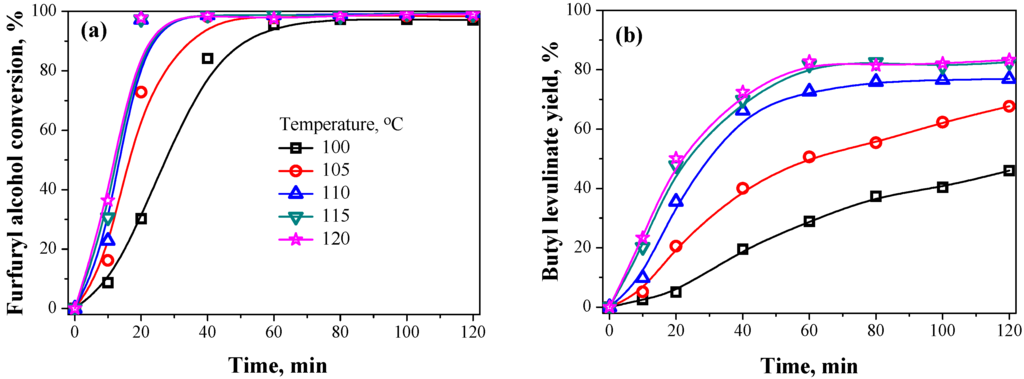 The effect of the reaction temperature (100–120 °C) on the conversion of furfuryl alcohol to butyl levulinate is presented in Figure 9. It can be observed that the reaction temperature played an important role in the reaction process, which had similar rules as that of the CuCl2 dosage for furfuryl alcohol conversion and butyl levulinate yield. Under lower temperature conditions, the butyl levulinate yield grew relatively slowly with the prolonging of the reaction time. Only 46% and 67% yields of butyl levulinate were reached after the reaction time of 120 min at 100 °C and 105 °C, respectively. In contrast, furfuryl alcohol was almost totally converted within 60 min. A possible explanation for this appearance is that a large number of intermediates can be accumulated in the reaction process [6,36], which may need a longer time to achieve a complete reaction. Increasing the temperature to 115 °C, the conversion takes place at a faster rate and the yield of butyl levulinate increased rapidly with the extension of the reaction time, and the equilibrium point was reached by 60 min. With an elevated temperature of 120 °C, the reaction rate and final yield of butyl levulinate did not change substantially compared with that at 115 °C. Thus, it can be seen that the elevation of temperature is also unavailing for the extent of the reaction.