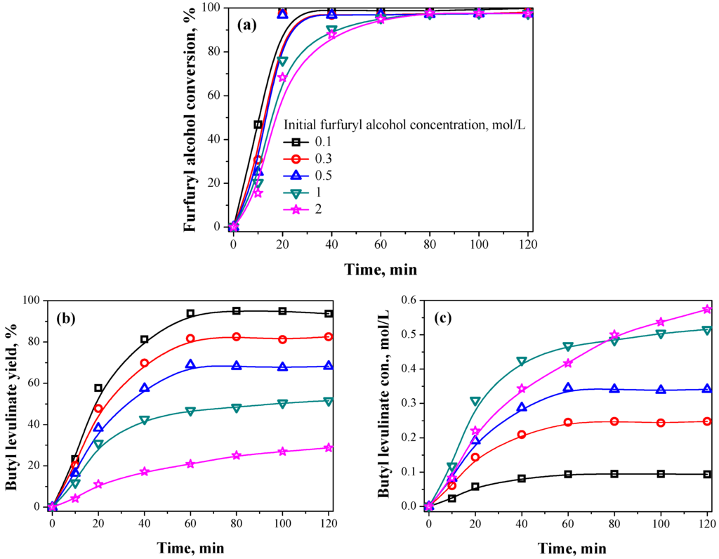Effect of initial furfuryl alcohol concentration on furfuryl alcohol conversion (a); butyl levulinate yield (b); and concentration (c) as a function of time. Reaction conditions: CuCl2 concentration of 0.02 mol/L; reaction temperature of 115 °C.