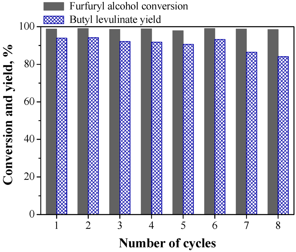 To assess the stability of metal salts as catalysts, a selected CuCl2 was recovered after the reaction and reused for the next run under comparable conditions. The separation of CuCl2 after the reaction was as follows: the solvent n-butanol and low boiling substances in the reaction mixture were firstly removed through rotary evaporation at 120 °C until a dense mixture was formed. Subsequently, high boiling n-tridecane was added to the residual component to help distil the heavy products (mainly butyl levulinate), which acted as desorption driving agent for heavy products. At this stage, the heavy products in the residue were separated out by vacuum distillation of 180 °C. This step was repeated three times. Finally, the obtained solid residue (i.e., recovered CuCl2) was directly dissolved in a certain amount of furfuryl alcohol and n-butanol with a specified proportion. The formed mixture was then transferred to reactor for the next run.