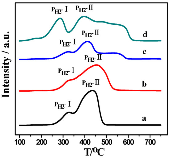 Hydrogen temperature-programmed reduction (H2-TPR) profiles of MgxCeyCo1−x−yCo2O4 composite metal oxides: (a) Co3O4; (b) Mg0.2Co0.8Co2O4; (c) Ce0.05Co0.95Co2O4; (d) Mg0.025Ce0.05Co0.925Co2O4. PH2-I: H2 reduction of Co3O4 to CoO; PH2-II: H2 reduction of CoO to Co0
