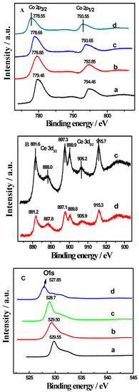 X-ray photoelectron spectroscopy (XPS) spectra of (A) Co2p; (B) Ce3d; and (C) O1s for the composite metal-oxide catalysts: (a) Co3O4; (b) Mg0.2Co0.8Co2O4; (c) Ce0.05Co0.95Co2O4; (d) Mg0.025Ce0.05Co0.925Co2O4.