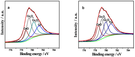As stated above, the Co2+ content of Me-, Co-doped Co3O4 samples increased due to a Co2p band shift to lower values. In order to determine the Co2+/Co3+ ratio on the surface of prepared Me-, Co-doped Co3O4, peak analyses were conducted for Co2p3/2, as shown in Figure 4. According to integral peak areas of Co2+, Co3+, and total surface Co content, the derived Co2+/Co3+ values were calculated and are listed in Table 2. It can be clearly seen that the Co2+/Co3+ value increased in the order of Co3O4 < Mg0.2Co0.8Co2O4 < Ce0.05Co0.95Co2O4 < Mg0.025Ce0.05Co0.925Co2O4, suggesting that Mg- and Ce-doping can increased the surface content of Co2+, and Mg0.025Ce0.05Co0.925Co2O4 possessed the highest Co2+ content with respect to other samples.