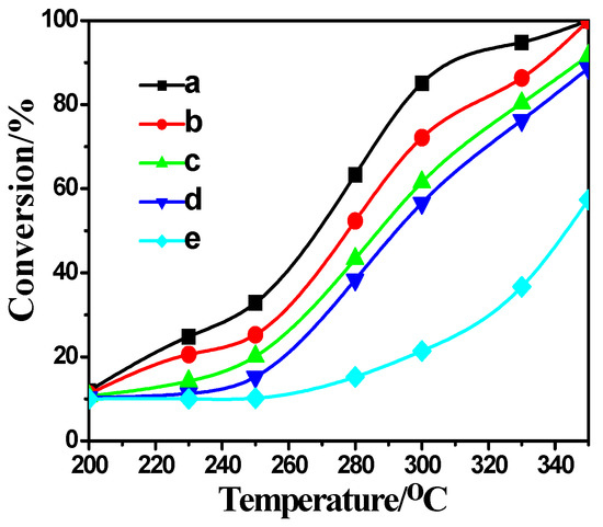 Activity measurement results of N2O direct dissociation over CexC1−xCo2O4 (x = 0.03, 0.05, 0.1, 0.2) composite spinel metal-oxide catalysts. Reaction conditions: N2O:He = 35:65, GHSV = 30,000 h−1; (a) Ce0.05Co0.95Co2O4; (b) Ce0.03Co0.97Co2O4; (c) Ce0.1Co0.9Co2O4; (d) Ce0.2Co0.8Co2O4; (e) Co3O4.