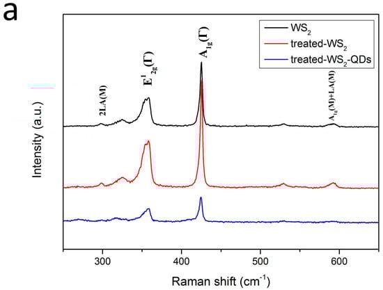 - Liang, L.; Meunier, V. First-principles Raman spectra of MoS2, WS2 and their heterostructures. Nanoscale 2014, 6, 5394–5401. [Google Scholar] [CrossRef] [PubMed]