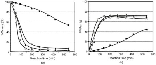 Figure 3 and Table 5 summarize the influence of temperature on the 1-octene metathesis reaction using precatalyst 15 after 540 min. As was the case with precatalysts 13 and 14, the 1-octene metathesis reaction using precatalyst 15 showed relatively low substrate conversion, PMP, IP and SMP formation and KIn, TON and TOF after 540 min. Generally, it showed low activity.