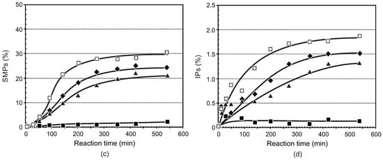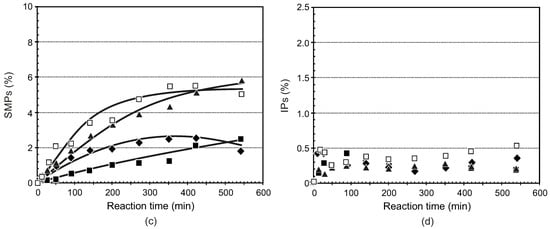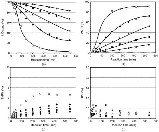 The influence of temperature on the reaction composition during metathesis of 1-octene using the ruthenium alkylidene precatalyst 14: (a) conversion of 1-octene; (b) formation of PMPs; (c) formation of SMPs; (d) formation of IPs; Ru/1-octene (1:9000) (■, 80 °C; ▲, 90 °C; ♦, 100 °C; □, 110 °C).