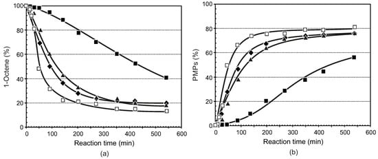 The catalytic activity of precatalyst 14 is summarized in Table 4 and Figure 2. A very low conversion of 1-octene (6%) to PMPs (5.3%), SMPs (0.8%) and IPs (0.1%) with 86% selectivity, 476 TON, 0.71 × 10−3 KIn and 1.47 × 10−2 TOF is observed for 1-octene metathesis. The reaction did not even reach equilibrium after 3570 min, at which point, the reaction was stopped.