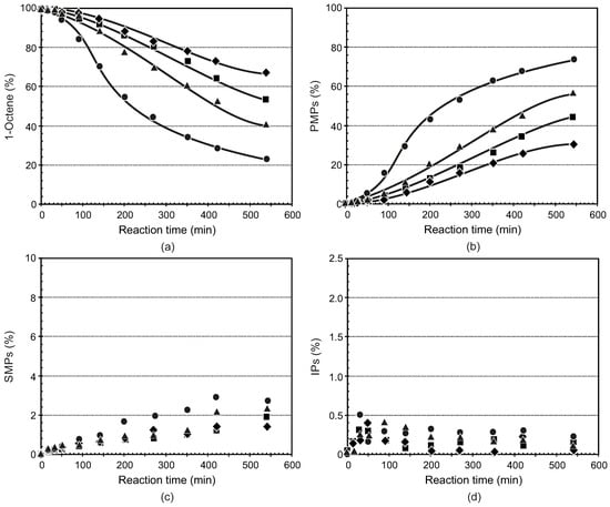 The influence of temperature on the reaction composition during metathesis of 1-octene using the ruthenium alkylidene precatalyst 15: (a) conversion of 1-octene; (b) formation of PMPs; (c) formation of SMPs; (d) formation of IPs; Ru/1-octene (1:9000) (●, 70 °C; ■, 80 °C; ▲, 90 °C; ♦, 100 °C; □, 110 °C).