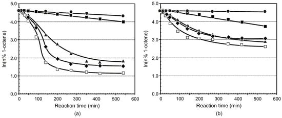 ln([n%1-octene]) versus time plots of: (a) precatalyst 13; (b) precatalyst 14; (c) precatalyst 15; (d) precatalyst 4 (●, 70 °C; ■, 80 °C; ▲, 90 °C; ♦, 100 °C; □, 110 °C).