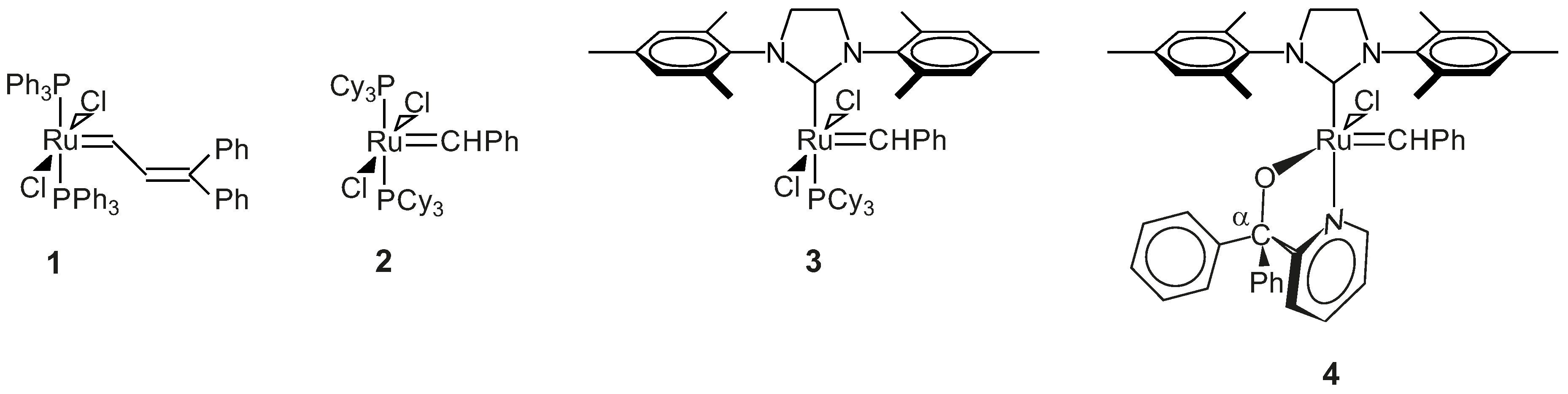 - van der Schaaf, P.A.; Kolly, R.; Kirner, H.-J.; Rime, F.; Mühlebach, A.; Hafner, A. Synthesis and reactivity of novel ruthenium carbene catalysts. X-ray structures of [RuCl2(CHSC6H5)(PiPr3)2] and [RuCl2(CHCH2 CH2-C,N-2-C5H4N)(PiPr3)]. J. Organomet. Chem. 2000, 606, 65–74. [Google Scholar] [CrossRef]