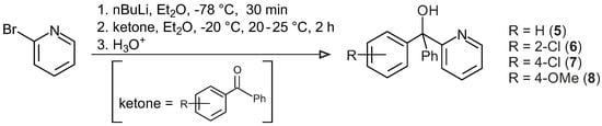 Although there are more than 21 different methods [] of synthesizing pyridinyl alcohols, we followed the straightforward and relatively simple synthetic route of Herrmann et al. [] to synthesize the pyridinyl-alcohols 5–8 (Scheme 2). As was mentioned earlier, our aim is synthesizing 1-(2′-pyridinyl)-1,1-diphenyl-methanols having chlorine and/or methoxy substituents on one of the phenyl rings.