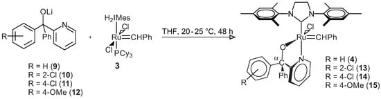 The lithium salts of the pyridinyl methanols 9–12 were added into a Schlenk tube containing a THF solution of the Grubbs 2 precatalyst in an argon atmosphere and stirred to result in the Grubbs 2-type precatalysts 4 and 13–15, as shown in Scheme 4.