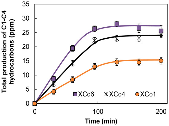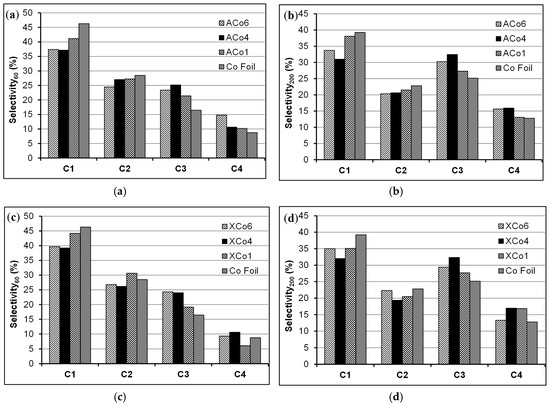 Figure 9a,c); being the carbon gels already more selective to C3 than the Co sheet at this reaction time. At a higher reaction time (200 min) using carbon gels, especially with ACo4 and XCo4, the above mentioned sequence changes, being the C3 hydrocarbon production close to or even higher than the C1 one (