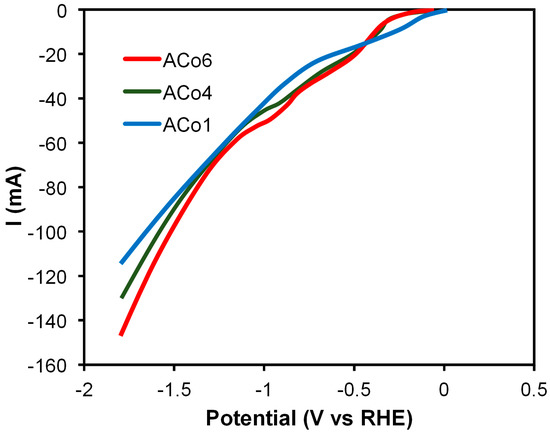 All cobalt-doped carbon gels were characterized by LSV. The cathodic sweep analysis was conducted from the equilibrium electrode potential to negative electric potential (−1.79 V vs. RHE), with a scan rate of 5 mV/s, using the same experimental conditions and reactor set-up that those for the electro-catalytic CO2 conversion.