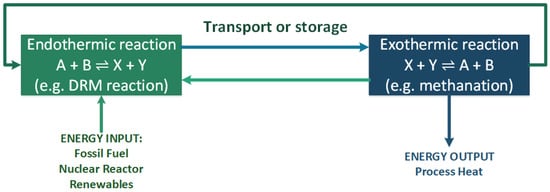 The first investigations concerning the transformation of CO2 and CH4 into synthesis gas were reported in 1888. The process was further studied by Fischer and Tropsch in 1928 [8]. Although DRM is not quite a new concept, the dry reforming reaction has again gained considerable attention in our days, due to the possibility of utilizing two greenhouse gases for the production of a very valuable mixture of H2 and CO—a building block for the production of synthetic fuels and chemicals. Moreover, DRM can be used as a way of valorizing natural gas fields containing high amounts of CO2, whose extraction is currently economically unprofitable. The concentration of CO2 in such gas fields can vary from a few percent up to even 70%, as reported for a natural gas field in Indonesia [9]. The studies carried out by Suhartanto et al. [9] confirmed the feasibility of using DRM technology for the energetic valorization of this field, which contains ca. 1320 billion cubic meters of gaseous hydrocarbons. Another possibility is the use of dry reforming in exothermic-endothermic reaction cycle systems for transport and storage of energy using the waste heat from renewables or nuclear energy to power endothermic reactions [10,11,12], as depicted in Figure 1.