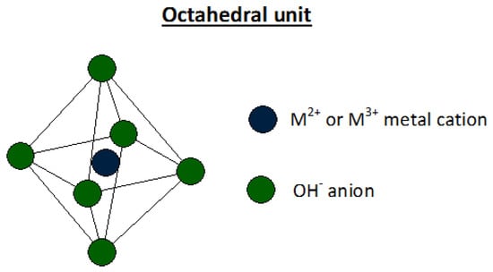 Hydrotalcite is a naturally occurring layered mineral, discovered in Sweden in 1842, of chemical formula: Mg6Al2(OH)16CO3·4H2O [49]. The name hydrotalcite comes from its resemblance with talc (Mg3Si4O10(OH)2), and from the high water content of this mineral. Similar to talc, the hydrotalcite mineral can be easily crushed into a white powder. Hydrotalcite occurs in nature in foliated and contorted plates and/or fibrous masses [49]. From a crystallographic point of view, this mixed magnesium and aluminium hydroxycarbonate possesses the trigonal structure of brucite, i.e., magnesium hydroxide Mg(OH)2. Hydrotalcite layers are built of octahedral units in which a divalent or trivalent cation is placed in the center of an octahedron and six OH− groups are placed in the corners of the octahedron (Figure 2). As with brucite, octahedral units are linked by edges, forming in this way parallel layers. Depending on the arrangement of the layers, the hydrotalcite structure may have rhombohedral or hexagonal symmetry, in which the unit cell is built up from three and two hydrotalcite layers, respectively. For both naturally occurring and synthetic hydrotalcites, the rhombohedral symmetry is generally more common [49,50,51,52].
