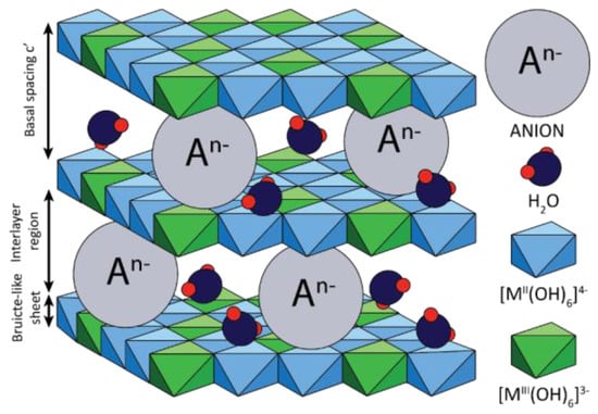 where M2+, M3+ are di- and tri-valent cations; A—interlayer anions; and x—mole fraction of trivalent cations. The part [M2+1−xM3+x(OH)]2 describes the composition of brucite-like layers and [(An−x/n)·mH2O] describes composition of interlayer spaces.