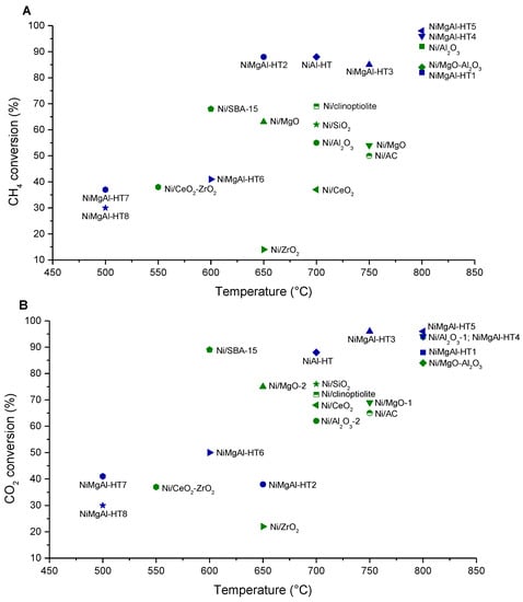 Catalytic activity of nickel-based catalysts in dry reforming of methane: (A) CH4 conversions and (B) CO2 conversions, as a function of temperature; Green