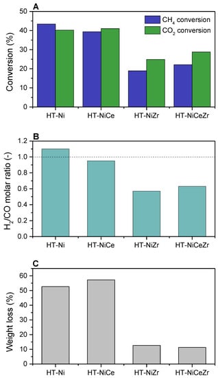 The results of DRM catalytic tests over Ce- and/or Zr-promoted catalysts: (A) CH4 and CO2 conversion (B) product distribution and (C) results of thermogravimetric measurements for spent catalysts. Adapted from [89].