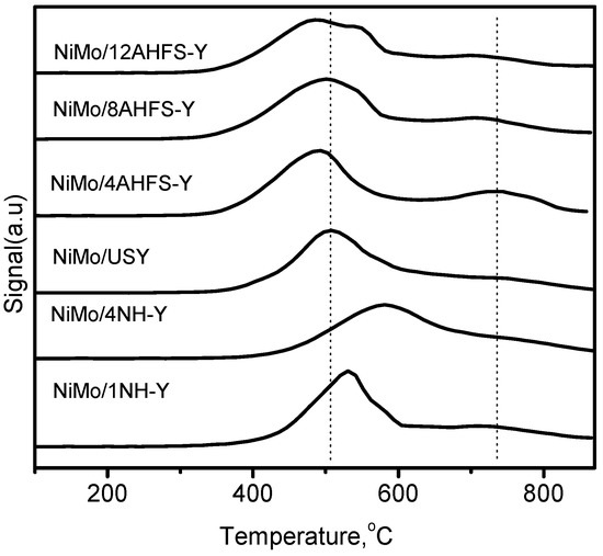 The influence of AHFS or alkaline treatment on the active phase was investigated by hydrogen temperature-programmed reduction (H2-TPR). As shown in Figure 3, the desilicated and dealuminated catalysts showed two principal reduction peaks. The low temperature peak around 500 °C was very broad and more intense, associated to the reduction of Mo6+ to Mo4+ of polymeric octahedral Mo species and NiMoO4−-like phase weakly bound to the zeolite surface [31,32]. The reduction peak at about 730 °C was assigned to the reduction of tetrahedrally coordinated Mo species (MoO3 phase) in the zeolite cavities [33,34]. After AHFS treatments, the peak at ca. 500 °C gradually dissociated into two peaks, respectively assigned to the reduction of polymeric octahedral Mo species and NiMoO4−-like phase. The peak temperature for the polymeric octahedral Mo species shifted to the lower but the peak temperature for NiMoO4−-like phase shifted toward higher. Moreover, the intensity and area of the peak around 500 °C significantly increased and the peak intensity for MoO3 phase also increase a little as the AHFS concentration increased. These suggested that large amount of Mo species in NiMoO4− and MoO3 phase were produced in the AHFS-treated catalysts. After alkaline treatments, the peak around 500 °C shifted to a higher temperature, but with a slight increase of the intensity and area as the alkaline concentration increased, suggesting that the proportion of NiMoO4− phase increased with a little increase of the total metal active sites. These results indicated that the AHFS treated catalysts could better improve the dispersion of the active metal to produce more active sites than NaOH-treated catalysts. This was also further proved by CO chemisorption (see Table S1).
