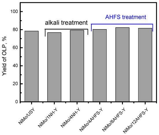 The desilicated and dealuminated USY supported sulphide NiMo catalysts showed high activity for the hydroconversion of WCO. The conversions of WCO were all most 100% for all the experiments. As shown in Figure 4, the yield of organic liquid products (YOLP) over the NaOH-treated catalysts were almost the same with that of USY, although the amount of strong acid sites of these catalysts was larger than USY. However, the YOLP increased with the severity increase of the AHFS treatment. The 82.3% yield of organic liquid products was obtained on the NiMo/8AHFS-Y catalyst. This indicated that the AHFS treatment could avoid excessive cracking to improve the yield of organic liquid products.