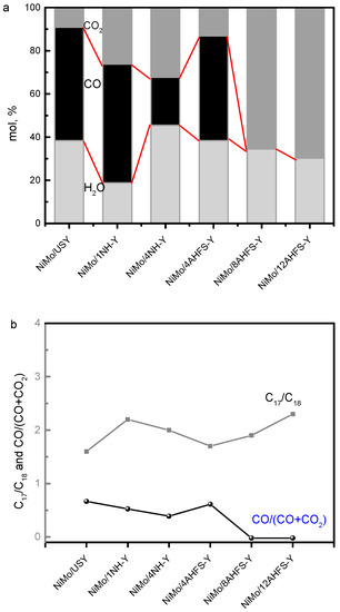 The catalytic conversion of triglycerides to hydrocarbons proceeds through three reaction pathways, hydrodeoxygenation (HDO), decarbonylation (DCO), and decarboxylation (DCO2) [9]. The decarbonylation (DCO) and decarboxylation (DCO2) produced alkanes with one less carbon than the original fatty acid, but the same carbon atoms by hydrodeoxygenation (HDO). Thus, the molar ratio of C17/C18 could reflect the tendency of DCOx/HDO reactions. Figure 5 shows the distribution of H2O, CO, and CO2 produced by different reaction pathways. The observed CO2/CO ratios represented the relative rates of DCO2/DCO ignoring the water-gas-shift reaction. From Figure 5b, the yield ratios of C17/C18 increased for the AHFS treated catalysts and the CO/(CO + CO2) ratio was down to 0 under high AHFS concentration. This was in agreement with the results of the DCOx selectivity increasing with the increase of Si/Al ratio in the NiMo/SiO2-Al2O3 catalysts [35]. In our previous research, we found that the Mo5+ and Mo6+ species mainly contributed to the DCOx reactions, especially the DCO2 reaction, and Mo4+ favoured the HDO reaction. As shown in Figure 3, there were more Mo species in NiMoO4− and MoO3 phase produced in the high AHFS-treated catalysts, which were generally accepted to be the active sites for DCO2 reaction [36]. Therefore, the high selectivity of the DCO2 reaction was achieved over the NiMo/8AHFS-Y and NiMo/12AHFS-Y catalysts. As for the NaOH-treated catalysts, the C17/C18 ratio increased and the CO/(CO + CO2) ratio gradually decreased, indicating that the selectivity of DCOx, especially the DCO2 reaction, was improved due to the increase of the NiMoO4− phase content. These results suggested that both the desilication and dealumination could enhance the selectivity of DCOx, especially DCO2 reaction, in the hydroconversion of WCO. The dealumination with AHFS was a more efficient method to enhance the selectivity of DCO2 reaction, and more than 67% DCOx selectivity (100% in DCO2) reactions were achieved over high AHFS-treated catalysts.